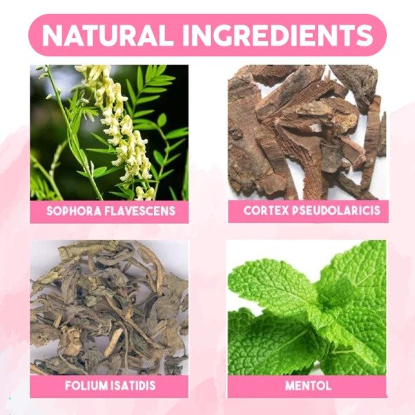 - Hlavní složky: Sophora Flavescens, Cortex Pseudolaricis, Folium Isatidis, Menthol